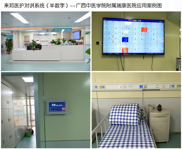 功能实现:病房病人可通过床头分机与护士站主机、医生主机相互呼叫、双工对讲;护士站主机可相互托管所属病床分机;护士站之间可相互可视对讲;病房门口机可显示病房内的病人信息以及责任医生与护士的姓名、照片信息等;护士进入病房护理时,可门灯提示护士已进入病房护理中,同时护士可利用本房间内的病床分机接听其他房间病床分机呼叫及对讲;病床分机可液晶屏查看病人住院信息;病床病人可通过分机电视伴音功能收看电视节目;护士站可对病房内的病人进行全区广播、分区广播、MP3文件广播或定时广播等;卫生间的病人发生紧急情况可发出紧急报警信号;病区门口的家属可呼叫护士站进行可视对讲及开锁。