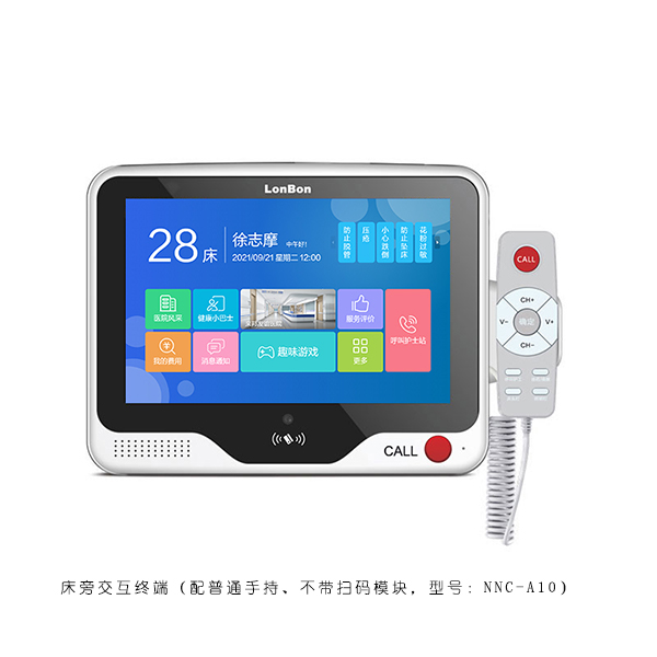 • 采用10.2英寸触摸显示屏,支持1080P高清视频,含刷卡模块、蓝牙模块,可另购yl23455永利专用支架固定在重病房的床头上方