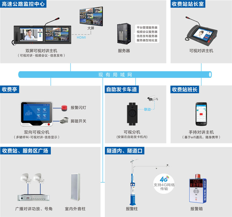 基于IP网络架构(可跨网段跨路由)技术,主要用于高速公路日常管理和突发事件的指挥处理。系统以监控中心为最高管理级别集中管理所有对讲、广播、发布终端设备,各收费站之间分布式管理,形成多级别、分布式管理架构体系。