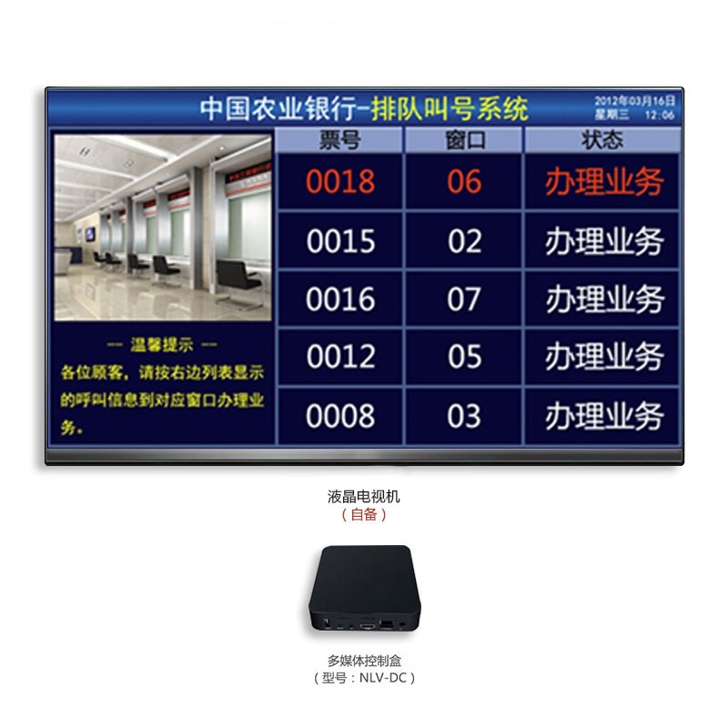 液晶电视机(自备)组成。建议选42英寸以上液晶电视机,可作为等候显示屏使用,一般放置在休息大厅的休息等待区。