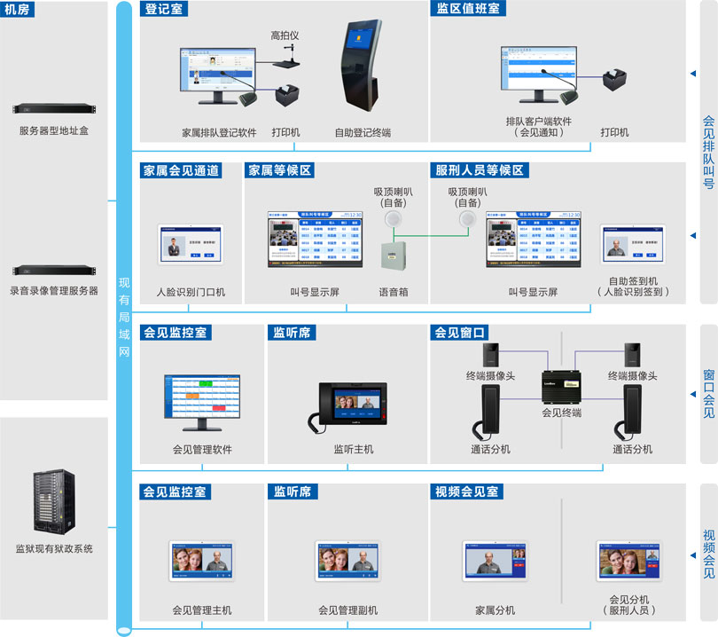 监听监视:可将会见双方面部表情和通话语音融合在一个画面进行监听监视。