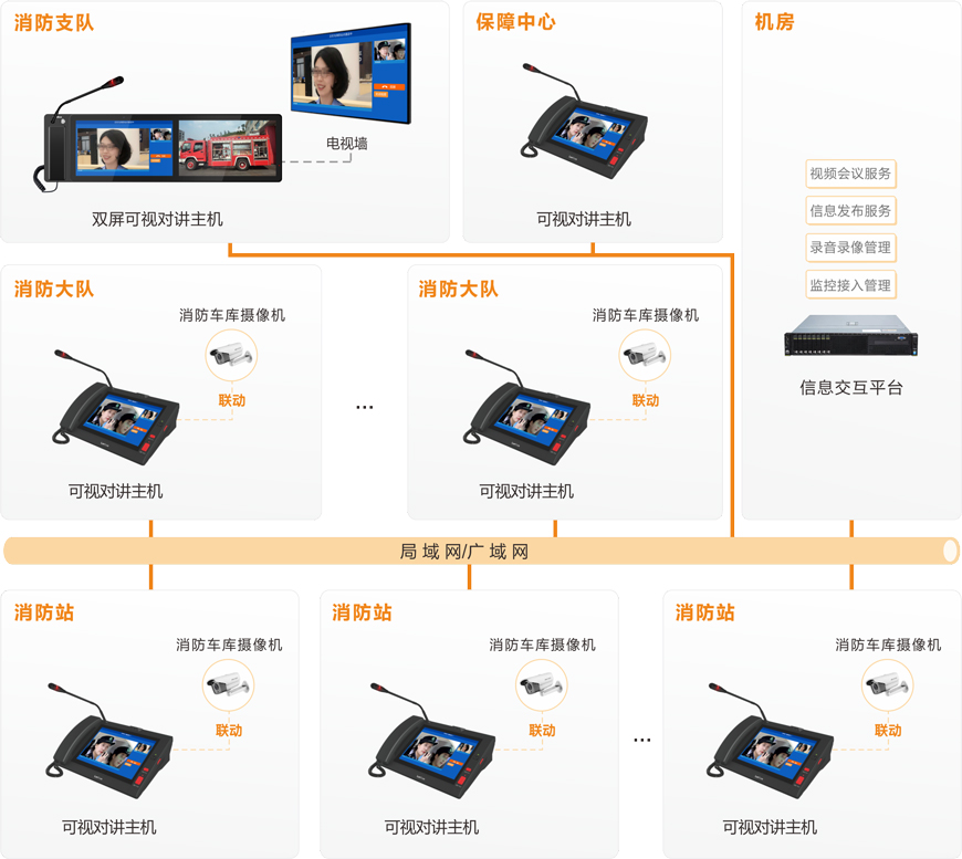 系统基于IP网络架构,以高清音视频通讯技术为核心,构建了一套功能完善、实时性高、扩展性强的联网式音视频实时交互平台,实现消防支队指挥中心通过现有消防平台联动对讲系统、到达与消防大队、各消防站之间的快速建立视频通话、视频会议、录音录像、通知发布等功能。