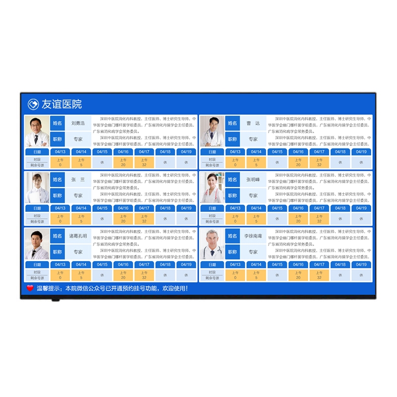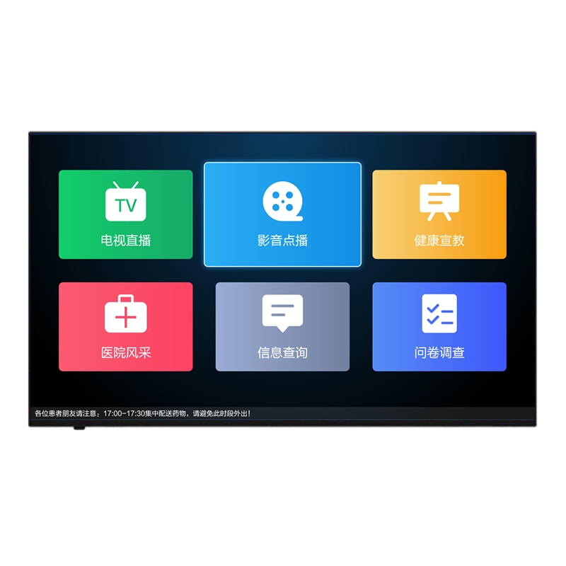 • 采用65英寸液晶显示屏,壁挂或吊装(支架需另购)安装在大厅、公共休息区等公共区域。