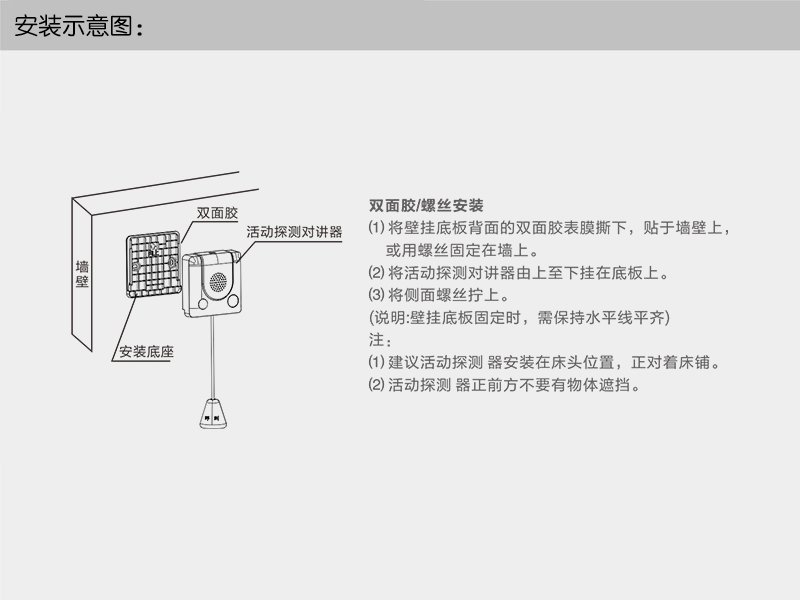 • 支持双向语音通话、拉绳报警、按键报警、喊话报警、居所内无生命活动报警等功能。