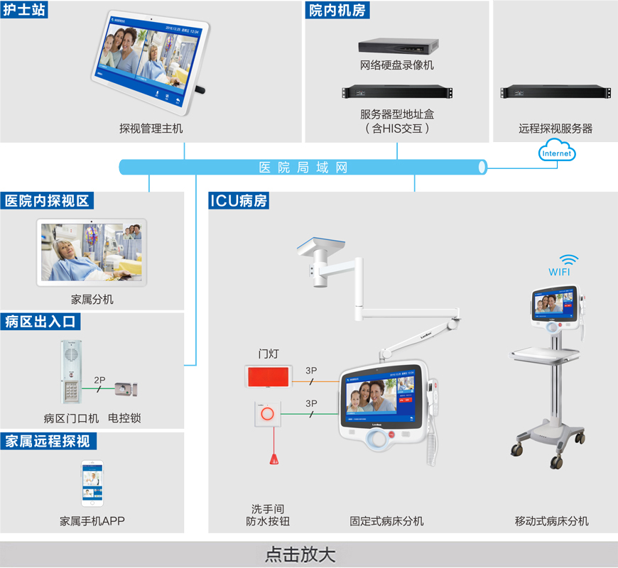 专用于医院ICU重病房患者与家属之间的探视对讲,是以音视频对讲为主的探视系统。系统基于网络传输,以TCP/IP协议传输视频、音频和多种控制信号,易于Internet连接和访问。