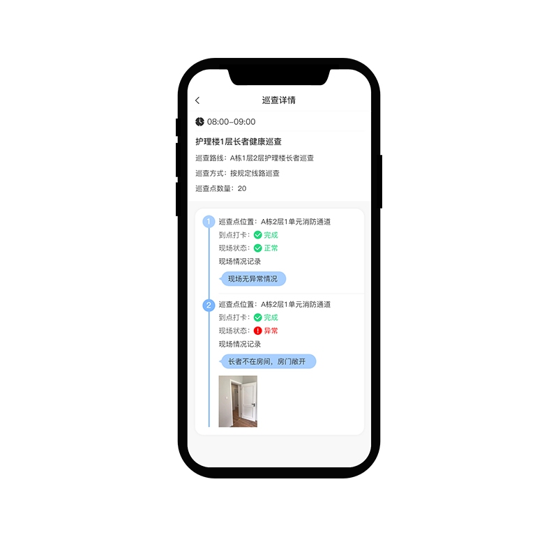 • 可按设定好的路线、时间、顺序对巡更点进行逐一查看,并能通过手机App对现场情况进行文字和拍照记录,并自动上传。